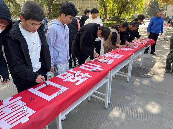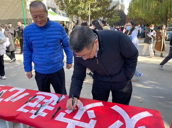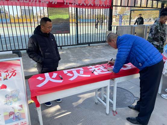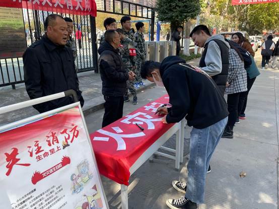 2.2021年11月9日中午,保卫处在咸阳校区操场门口组织开展了消防安全承诺签名活动。活动于11:30正式开始,此时正值学生下课高峰,操场至食堂道路上人头攒动,活动现场氛围热烈,广大师生纷纷在“火灾起心莫慌,湿毛巾捂口鼻”横幅上签下自己对消防安全的承诺。保卫处工作人员耐心的为过往师生介绍横幅的内容及参与签名的意义,并引导师生阅读消防安全宣传展板,学习火灾逃生知识。师生员工纷纷表示这次活动的开展意义重大,对全校师生提高消防安全意识,杜绝意外事故起到了很好的教育促进作用。活动取得了圆满的成功。