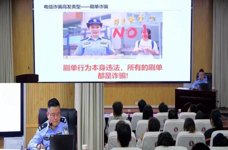 讲座中,王甲睿紧紧围绕“什么是电信网络诈骗”“电信网络诈骗类型”“我们该怎么做”等内容,从近期涉校案件实例切入,深刻揭露电信网络诈骗的特点、类型、手段及危害,生动详细地讲解应对诈骗的措施和方法,同时重点讲解了我国最新出台的《反电信网络诈骗法》,强调任何人都不得出租、出借或非法买卖电话卡和银行卡。提醒广大师生要重视自己密码的设定、增强安全意识,不随意透露自己的手机验证码、不随意刷脸支付、不要下载无关的APP等,并下载国家反诈中心APP。