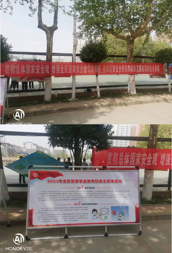 在操场门口悬挂宣传标语横幅,在操场门口、教学楼大厅、食堂门前等人流密集区域,放置国家安全法律常识、反邪教警示教育进校园、防范间谍知识、公民举报危害国家安全行为奖励办法等相关展板,向师生员工普及国家安全教育基本内容。