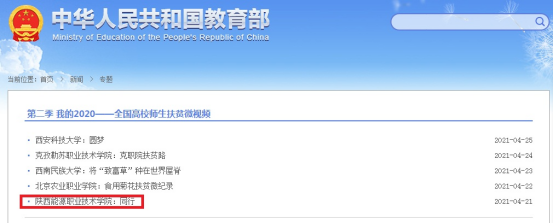 4月21日,我校微视频《同行》入选教育部第二季“我的2020—全国高校师生微视频征集展示活动”,并在全国教育脱贫攻坚微视频展播活动”中展播。这是近年来陕西省高职院校在国家脱贫攻坚成果展示中首个展出的作品。