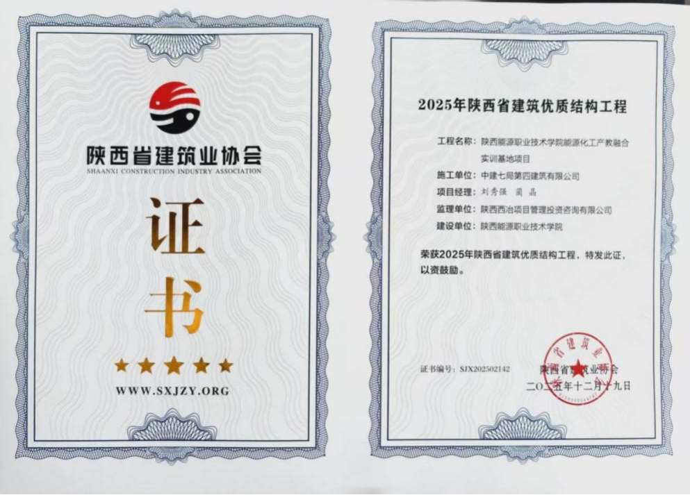 能源化工产教融合实训基地项目2024年3月开工建设,2025年10月结构主体封顶,在各参建单位的共同努力下,12月19日顺利通过陕西省建筑业协会评审,喜获“2025年陕西省优质结构工程”。