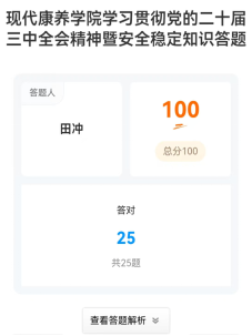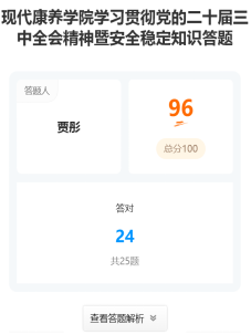 为学习贯彻党的二十届三中全会精神,全面深入把握全会精神,坚持以教育家精神为指引,提升高校教师育人本领,同时,结合学校近期工作安排,认真学习落实学校党委关于近阶段安全稳定工作的会议精神内容,抓实抓细校园安全稳定工作,防范遏制校园安全事故发生,现代康养学院工会于2024年11月24日至12月4日开展了学习贯彻党的二十届三中全会精神暨安全稳定知识答题活动,全院教职工积极参与。