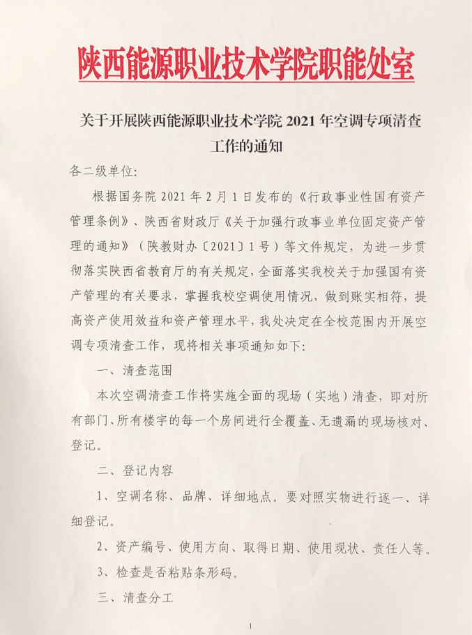 关于开展陕西能源职业技术学院2021年空调专项清查工作的通知