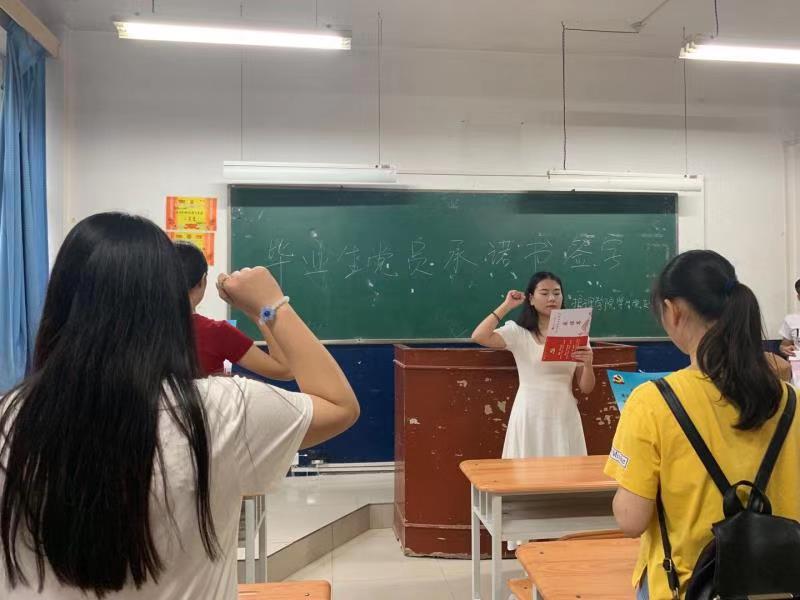 随后,大家逐字逐句,认真学习《毕业生党员承诺书》的内容,并郑重签字,承诺走出校门后,始终在思想和行动上与党中央保持高度一致,继续发扬党的优良传统,不忘初心、牢记使命,增强“四个意识”,坚定“四个自信”,做到“两个维护”,高标准严要求,践行今日之承诺,在不同岗位上展现新时代党员风采。签字完毕后,在16级学生党员尚美琪的带领下,全体毕业生党员集体重温入党誓词,庄严宣誓。