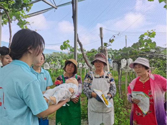实践队成员董露为常梅指导气道异物急救--海姆立克急救术