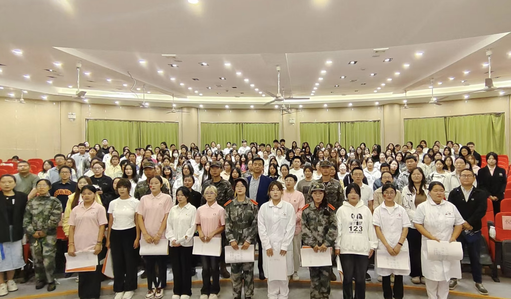 9月29日晚,护理学院在临潼校区105教室举办“护生齐献礼,点亮中国红”——诗歌朗诵比赛,热烈庆祝中华人民共和国成立75周年。学生处与护理学院领导、军训教官代表、全体辅导员及部分学生等200余人参加活动。