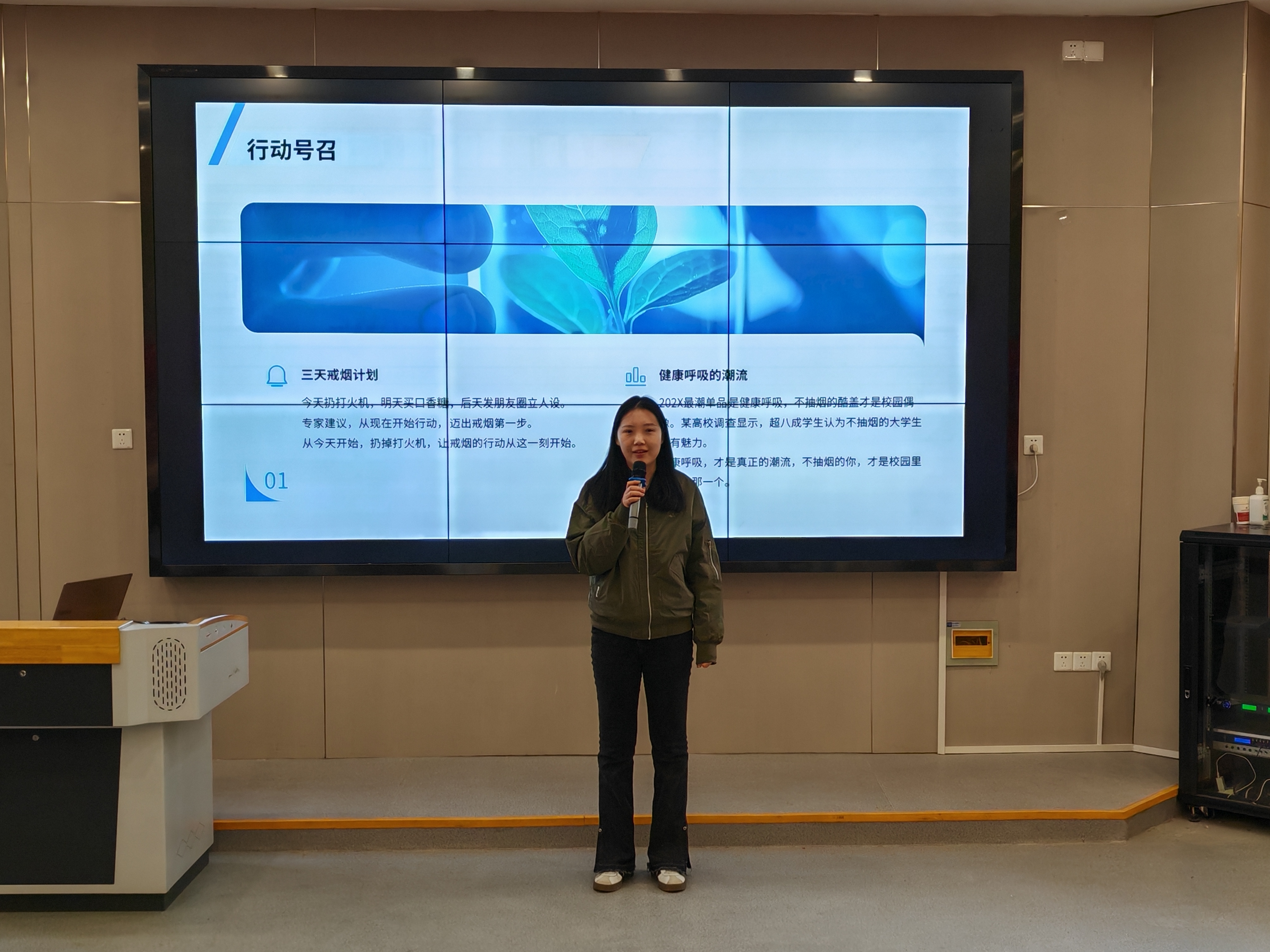活动开始,李世奇老师结合医学生特色,讲解了二手烟对呼吸道护理、心血管健康等的影响。随后,王静雯老师分享了在临床接触COPD(慢性阻塞性肺疾病)患者的真实案例,引发在场同学对烟草危害的深刻共鸣。同学们纷纷表示作为未来的医疗工作者,更应身体力行,作健康生活方式的示范者。