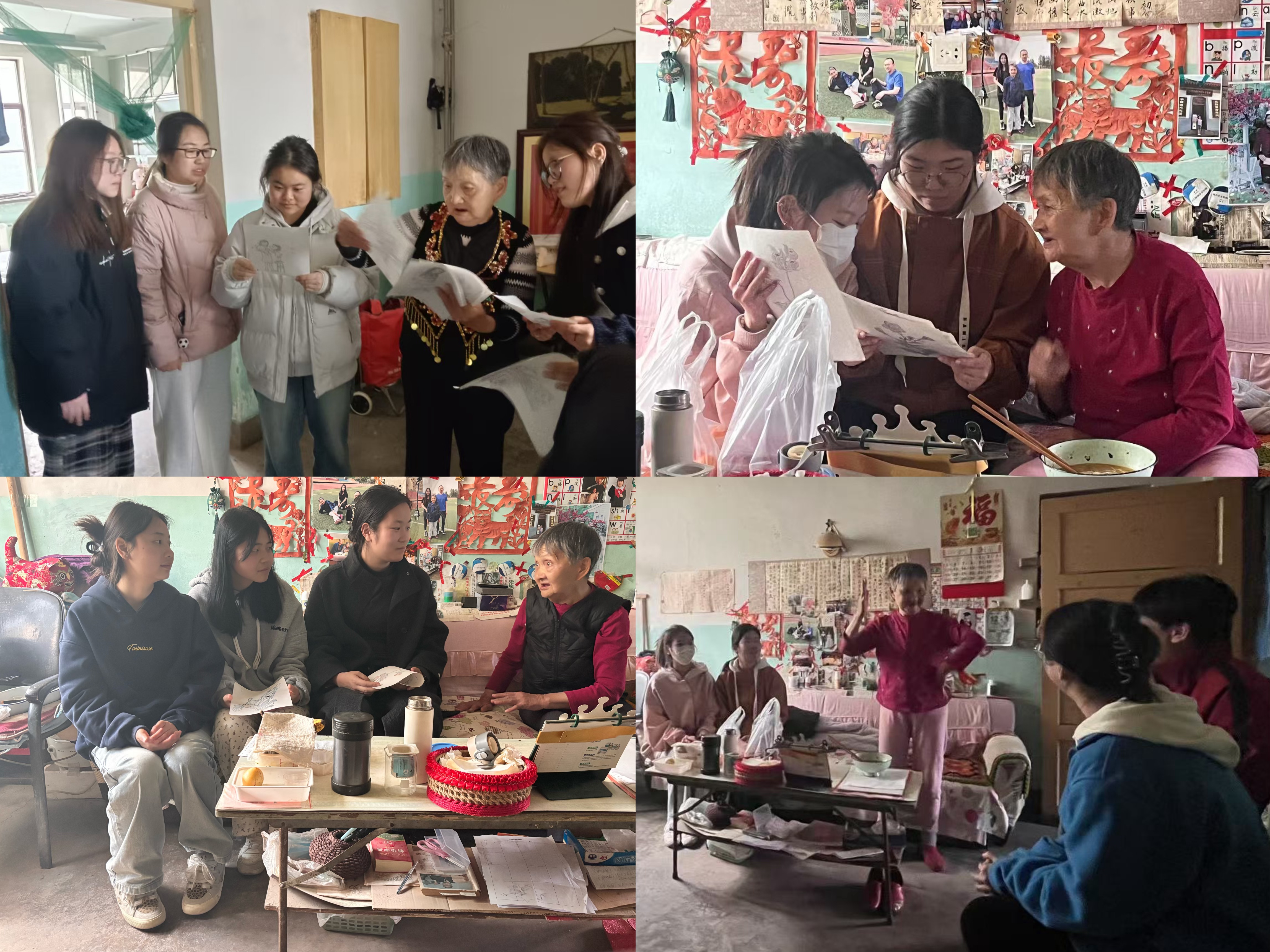 部分班级利用自己的专业知识进入社区,为社区老人送上关爱,帮空巢老人打扫房间和表演节目,为老人送来欢乐。
