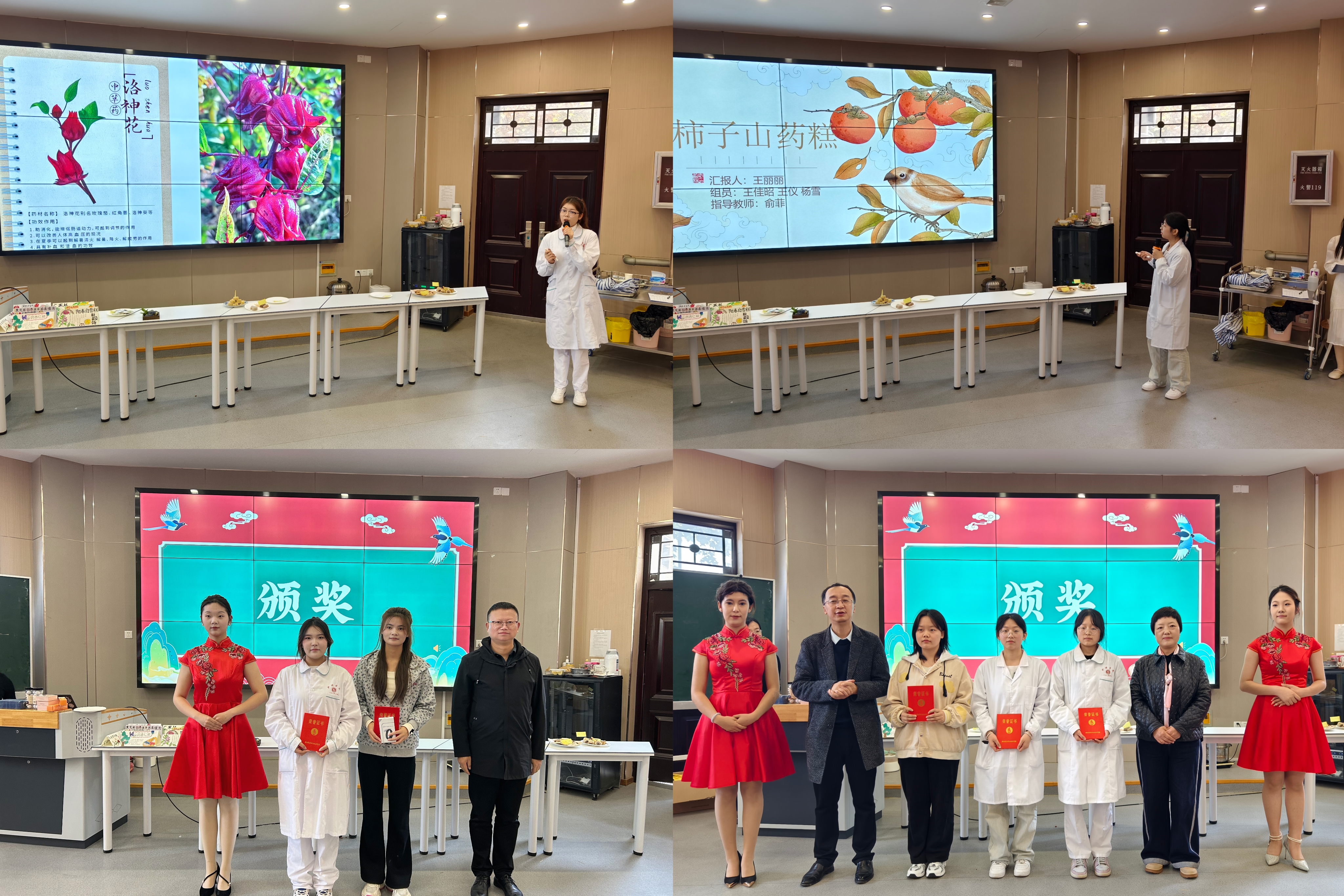 本次比赛共分为两轮。第一轮药膳品鉴。17组学生提交各自制作的药膳,由评委分别品鉴,然后从色、香、味、形四个方面评价,选出9组进入第二轮。第二轮药膳科普展示。学生从药膳原料、做法、功效、适宜人群等方面对作品进行讲解,根据第一轮和第二轮成绩最终评选出获奖小组。