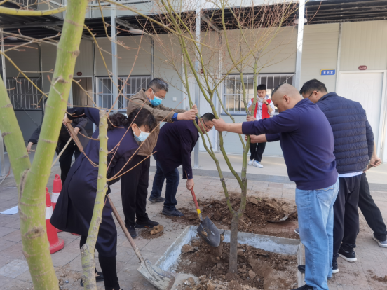 植树活动现场,大家手拿铁锹、锄头、水桶,挥汗如雨埋头干活,劳动场面热火朝天。在后勤保障处绿化科园艺师傅的指导下,大家互相配合,有的挥锹铲土、有的扶树填土、有的培土浇水,忙得不亦乐乎。经过一个多小时的劳动,红枫树苗在小院里“安家落户”,为健康驿站添上了一抹新绿。