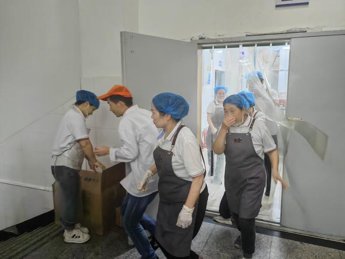 疏散逃生环节,模拟餐厅后厨因电气故障引发“火情”,随着尖锐的警报声划破现场,演练正式启动。餐厅从业人员迅速进入应急状态,按照预设分工,第一时间切断后厨总电源、关闭燃气阀门,杜绝“火情”蔓延风险;随后在引导人员的指挥下,俯身弯腰,沿着贴有安全标识的预定线路快速移动,全程无拥挤、无慌乱,最快速度全部撤离至室外安全区域,高效完成疏散任务