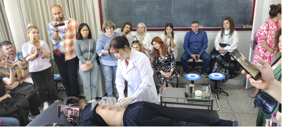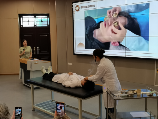 我校国家级教师创新团队骨干教师王晶晶对中医诊疗技术的起源、应用等进行了讲解,现场展示了核桃灸等中医相关技术,使来访两国中医药学会访问团成员产生了浓厚兴趣。俄罗斯、哈萨克斯坦两国代表介绍了中医在各自国内的发展和应用情况。