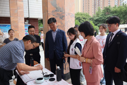 在校园文化介绍环节中,韩国学生为我校师生带来了特色节目,充分展现了他们的青春风采与文化自信,赢得阵阵掌声。我校邀请韩国学生体验非遗文化活动,参与非遗漆扇制作。学生们在专业教师指导下,亲身体验中国传统工艺的精妙。人文教育学院党总支书记买中傲现场书写书法作品,为师生呈现了一场文化气韵浓厚的书法艺术展示。全北大学师生纷纷表示,此次活动不仅开阔了视野,更感受到中华非遗文化的深厚底蕴。