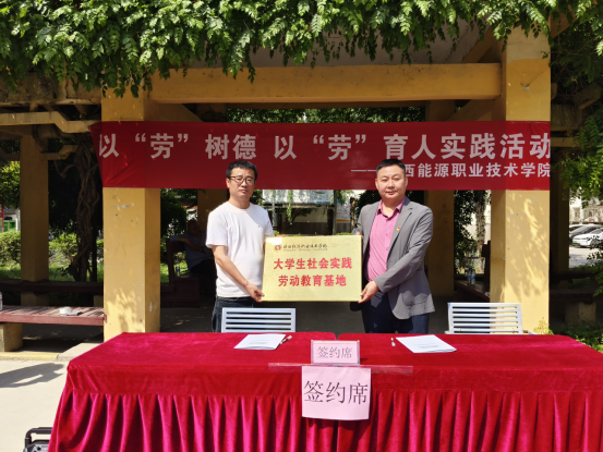 现代康养学院党总支书记唐恭贺与咸阳市渭城区文苑社区党支部书记肖斌代表校地双方签订共建协议,为大学生劳动教育基地揭牌。