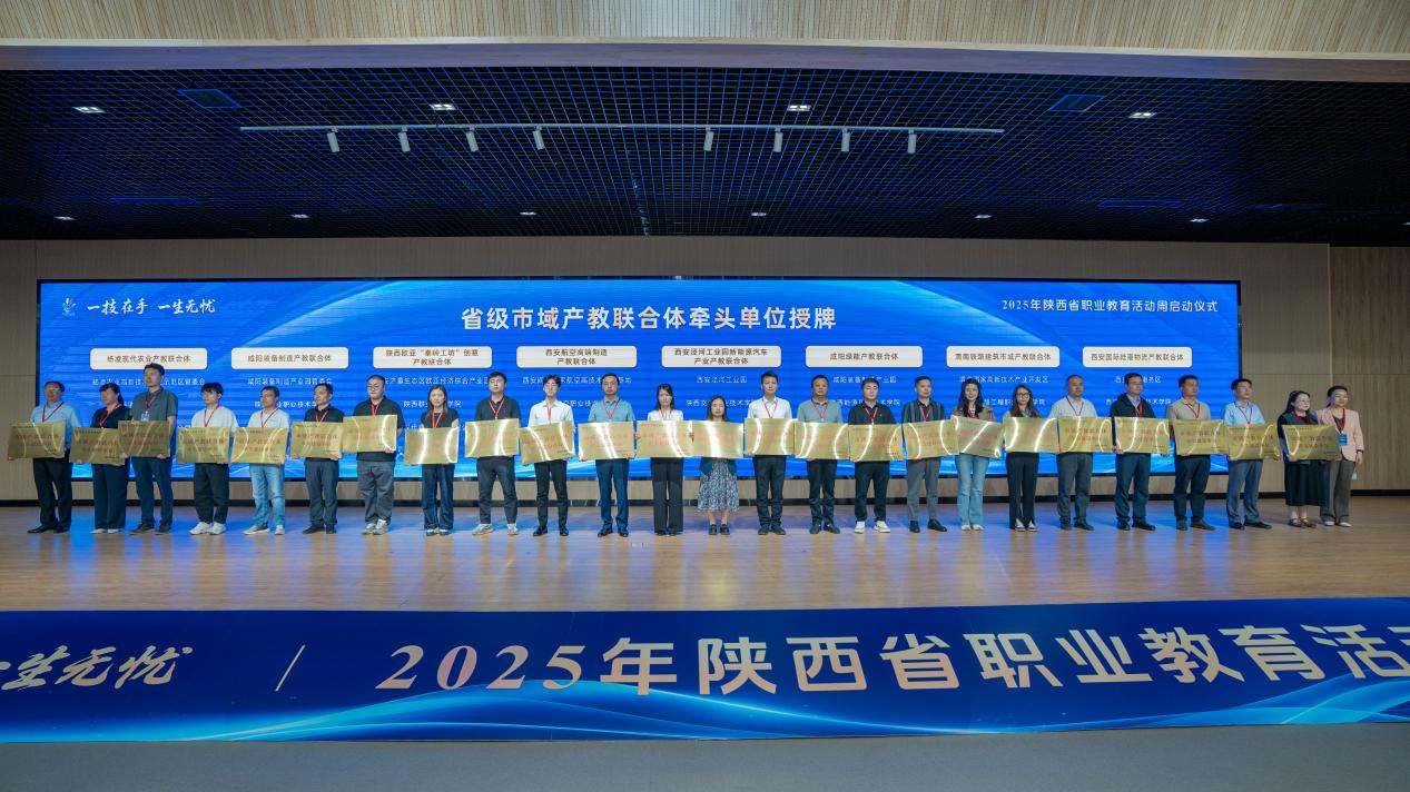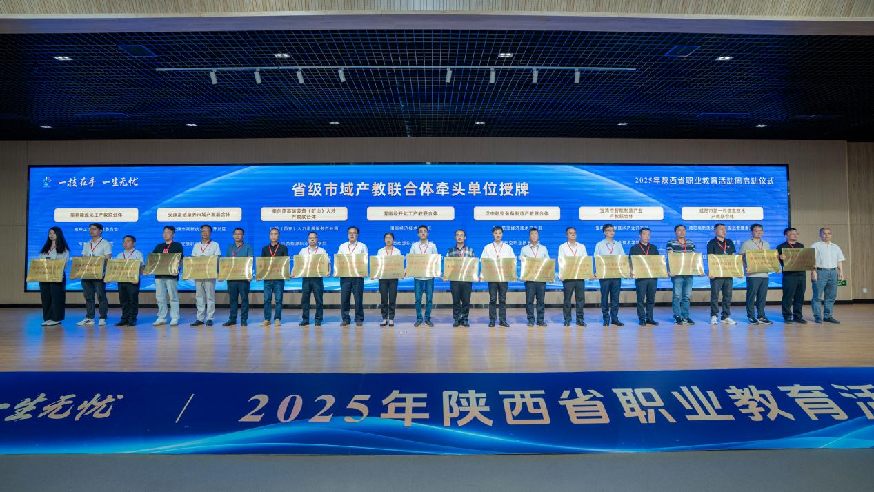 启动仪式上,中共陕西省委教育工委委员、省教育厅副厅长申雪峰出席启动仪式并讲话,陕西省政协副主席、陕西省中华职教社主任李忠民宣布2025年陕西省职业教育活动周启动。西安吉利汽车有限公司领导、职业院校代表、大国工匠及学生代表先后发言。省级10部门领导分别向35个省级行业产教融合共同体和29个市域产教联合体授牌。我校建设的煤炭行业产教融合共同体、康养行业产教融合共同体、食养食疗行业产教融合共同体、乡村医疗卫生行业产教融合共同体、咸阳绿能产教联合体、秦创原高端装备(矿山)人才产教联合体、渭南经开化工产教联合体各牵头单位代表上台接受授牌。会议期间,还启动了“匠心传承,寻找身边的能工巧匠”活动,并为2024年世界职业院校技能大赛金奖获奖项目颁奖。