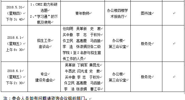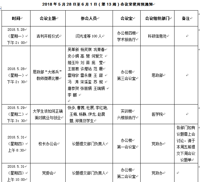 2018年5月28日至6月1日(第13周)会议安排预通知