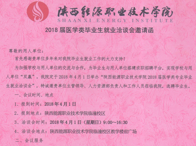 陕能院2018届医学类毕业生就业洽谈邀请函