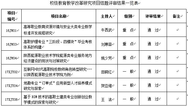 根据《关于开展2016、2017年校级教改研究项目结题验收和2018年校级教改研究项目申报工作的通知》(陕能院教〔2018〕7号)文件要求,截止2018年6月8日共收到结题申请6份、延期申请6份。