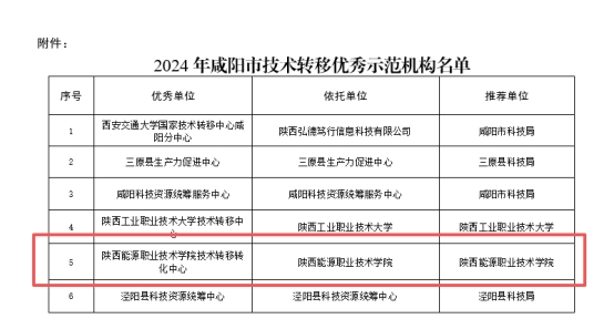 近日,咸阳市科技局公布了《2024年咸阳市技术转移优秀示范机构名单》,我校技术转移转化中心荣获优秀示范机构荣誉,全市共6家机构入选。