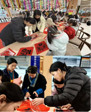 活动现场张灯结彩,处处洋溢着浓厚的节日氛围。阿里班学生们在老师的指导下,亲手拓印“福”字、窗花、门神等寓意吉祥的传统图案。宣纸轻覆于雕版之上,蘸墨、拍打、揭纸……一个个饱满鲜红的“福”字跃然纸上,一幅幅精美的窗花纹样栩栩如生。阿里班的学生们第一次接触“非遗拓印”,既新奇又专注。他们小心翼翼地操作,不时互相展示作品,脸上洋溢着成就感。通过指尖触摸非遗,同学们不仅感受到中华优秀传统文化的独特魅力,也在实践中加深了对春节习俗的理解与认同。