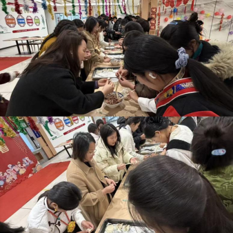随后,大家围坐在一起,热热闹闹地包起了饺子。老师们提前准备了新鲜的食材,调制出鲜香可口的馅料。师生们分工协作,有的擀皮,有的包馅,有的烧水,配合默契。不一会儿,案板上便摆满了形态各异的饺子。现场笑声不断,交流声此起彼伏,既有汉语的亲切问候,也有藏语的欢快笑语,语言虽异,心意相通。当一盘盘热气腾腾的饺子端上餐桌,大家围坐共享这顿充满仪式感的“团圆饭”。咬一口亲手包的饺子,再看看自己拓印的“福”字,阿里班的学生们笑着说:“虽然远离家乡,但在这里,我们一样有家人、有年味、有幸福。”这份跨越千里的温情,让冬日的校园暖意融融。