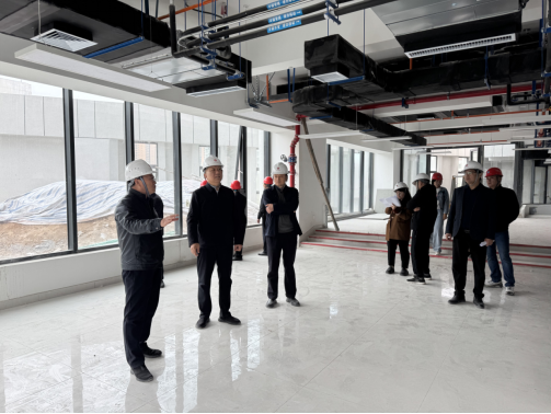 校领导一行首先对大楼首层报告厅及办公等区域的室内精装修完成情况进行了解,随后对地下车库及室外进行实地踏勘,听取了中建七局四公司对本工程近期建设情况的汇报。