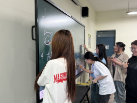 “每人一笔”环节,小组成员齐心协力画出猴子、房子、书包等,每人在画板上画一笔,大家合作完成一幅画,讲述画的意义。