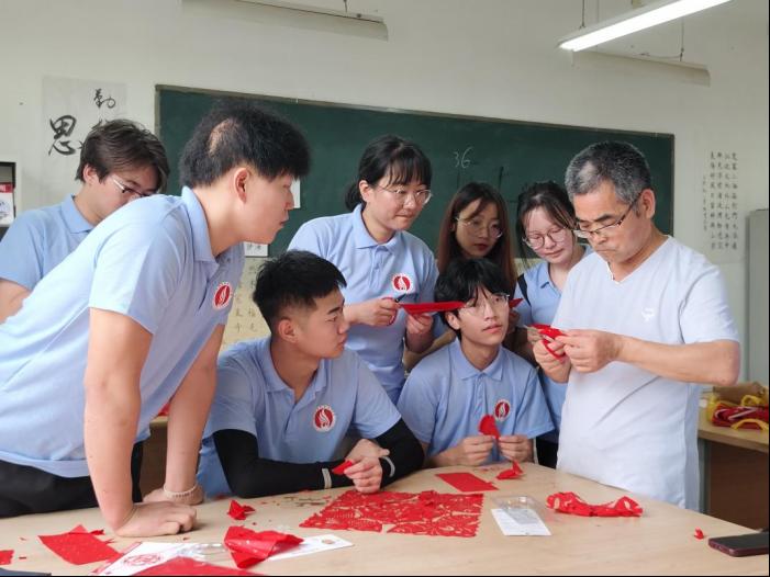 随后,韩四全手持剪刀,指尖轻轻地在“纸”上飞舞,将一张张红纸剪成形态各异的图案,展示了传统剪纸技艺的精湛和绝技。同时,他还向团队成员教授了简单的剪纸手法,并指导实践队员亲身体验剪纸文化,在队员们的实践中,一幅幅美丽的作品展现在我们眼前。