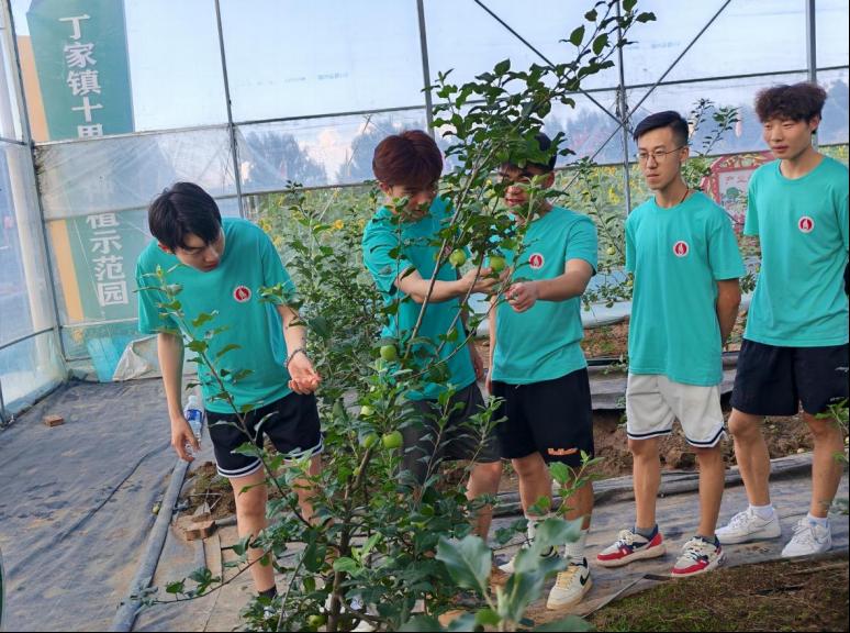 随后,实践团到达十里铺种植产业园、采摘园、蔬菜示范园,详细了解了丁家镇十里铺村农业产业发展情况。在温室大棚,种植着瑞香红苹果、乳瓜、圣女果、葫芦等,五彩斑斓,吸引各地游客来采摘。经村民讲解,实践团了解到现在园内公共设备不断完善,丁家镇十里铺逐渐成了乡村旅游“网红打卡地”。