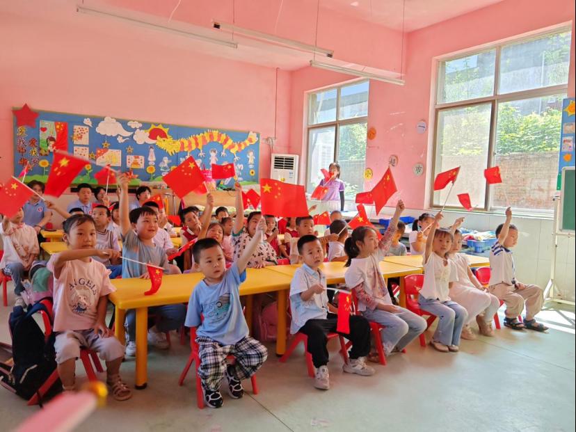 一进入幼儿园,队员们就受到了孩子们的热烈欢迎,在队员们进行了简单生动的自我介绍之后,支教活动在《歌唱祖国》的歌声中正式开始。随着孩子们的目光投向手中飘扬的五星红旗,队员们为孩子们讲述了国旗的基本知识,并进行了提问互动,孩子们积极配合,将爱国的种子深深地种在他们幼小的心中。课堂上,队员们采用零食奖励的方式,鼓励小朋友们积极参与课堂。