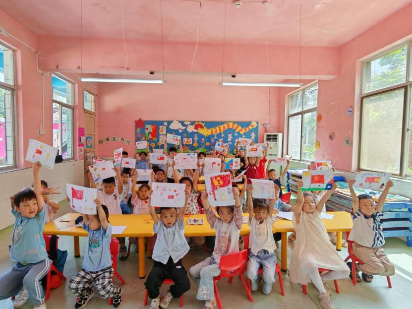最后,实践队员带领孩子们开展了一堂特别的美术课。带领小朋友们绘制五星红旗,通过绘画的形式表达对新中国75岁生日的祝福,激发他们的爱国热情。绘画过程中,小朋友们拿起画笔,认真绘制着国旗,并在绘画中画出了太阳、花儿等图案,用小小的手儿,丰富的想象表达了他们对祖国的祝福。
