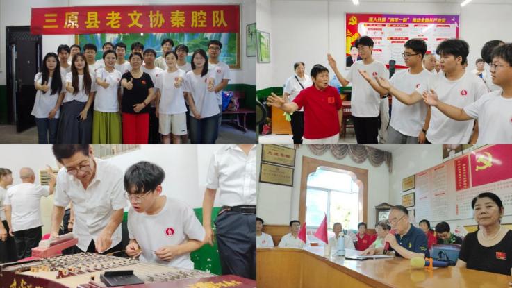 三原县老文协秦腔队,这个成员平均年龄在78岁的团队,在炎炎夏日里以精湛的技艺和饱满的热情,为实践队员们带来了一场精彩绝伦的秦腔表演。经典曲目《红灯记》选段中讲述了不屈不挠斗争的英雄故事;女声合唱《大登殿》展现了薛平贵的英勇和智慧;《望大陆》中体现了于右任先生深切的爱国情怀;由两位年过八旬的夫妇演唱的《十二把镰刀》以精湛的功底,展现了劳动人民的乐观与勤劳,深深感受到了秦腔这一古老非物质文化遗产的特殊韵味,征服了现场所有人。演出结束后,队员们对秦腔的技法、唱腔、身段、演奏乐器进行了简单学习,现场氛围反响热烈。
