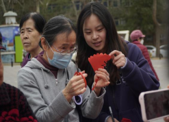 手工剪纸区吸引了不少中老年居民,志愿者们一边示范传统剪纸技法,一边讲解纹样背后的吉祥寓意。