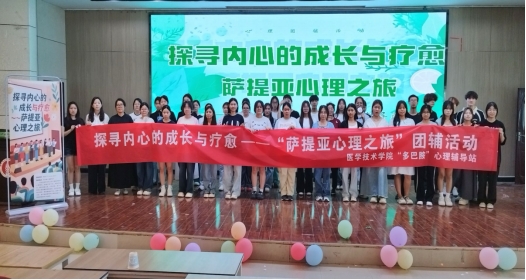 6月18日下午,为缓解同学们期末考试来临之际因学业压力带来的焦虑,医学技术学院多巴胺心理驿站在实训楼六楼报告厅举办“探寻内心的成长与疗愈—萨提亚心理之旅”心理团辅主题活动,学院120余名师生参与活动。