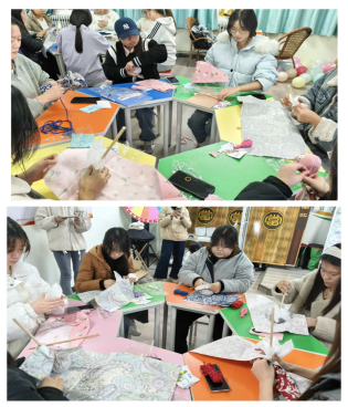 破冰环节“名唤左右”通过轻松互动快速拉近同学距离。“康养术语联盟”巧妙结合专业特色,让队员们在趣味配对中深化对康养知识的理解。在“压力卡片绘画”环节,同学们借助画笔与色彩,将无形的压力转化为具象的图画。通过非语言的创造性表达,大家不仅坦诚面对内心的情绪,也在分享与解读中实现情绪的宣泄与疏导。手工制作环节“艾香匠心锤”引人入胜,队员们互相指导,精心制作蕴含康养智慧的艾草锤,在实践过程中既体验了传统技艺的魅力,又增进了团队情谊。压轴环节“共筑康养能量树”将活动推向高潮,各队将书写着收获与祝福的能量元素共同贴绘成大树,象征着集体力量的凝聚与成长。