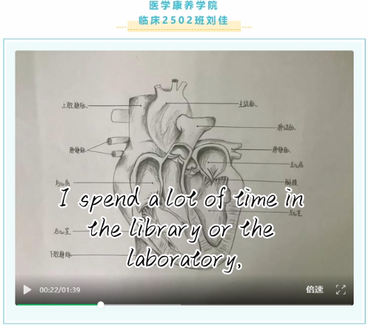在众多作品中,豆诗涵的参赛视频突破传统校园Vlog叙事框架,凭借新颖的镜头语言、富有巧思的转场剪辑与清晰流畅的内容结构,将校园日常与特色美食巧妙串联,充分展现了出色的新媒体创作能力与创新思维,为观众呈现了一场兼具视觉与听觉的精彩体验。刘佳的作品则以细腻温情的镜头,讲述了自己专注学业、勇攀知识高峰,同时利用课余时间投身戏剧社(DRAMA CLUB)的青春历程。作品叙事节奏张弛有度,情感表达真挚动人,于平凡的校园生活中挖掘出温暖深刻的成长力量,让观众在短短数分钟内,真切感受到医学生坚守初心、向阳而行的精神风貌,故事完整性与情感感染力俱佳。