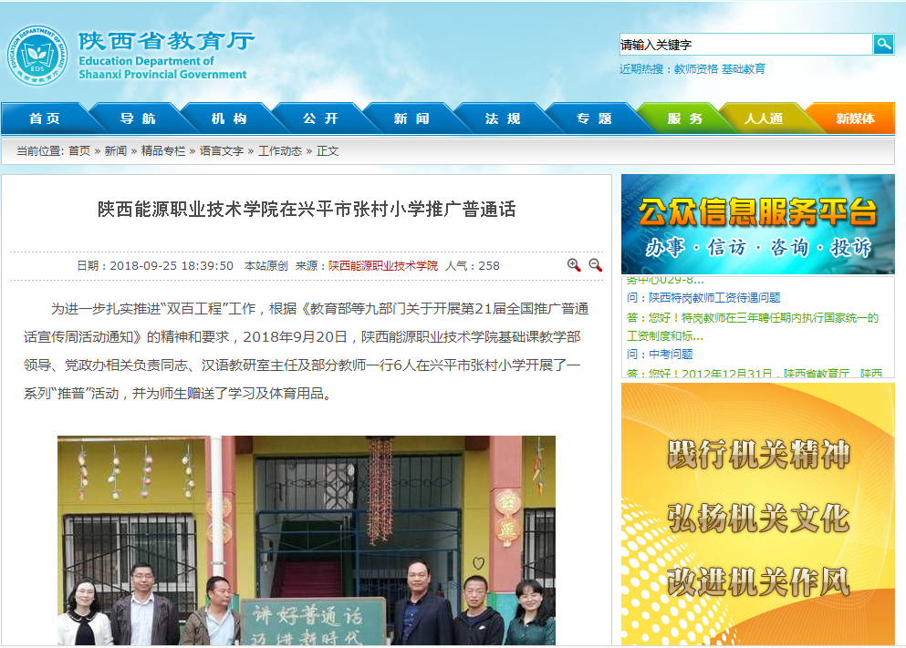陕西省教育厅:陕西能源职业技术学院在兴平市张村小学推广普通话