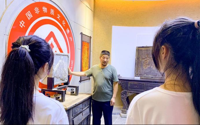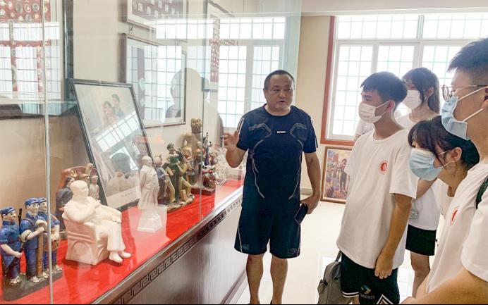 首先队员们来到了非遗文化展厅,展品收藏者陈大新老师向队员们一一介绍展列在馆内的藏品,有石刻孔子像、著名书法家于佑任书写的“诗书垂训”的匾额、木牛流马、八仙桌、三娘教子石雕、五节龙、鎏金柜等,一件件有温度有故事的藏品让队员们赞叹不已。