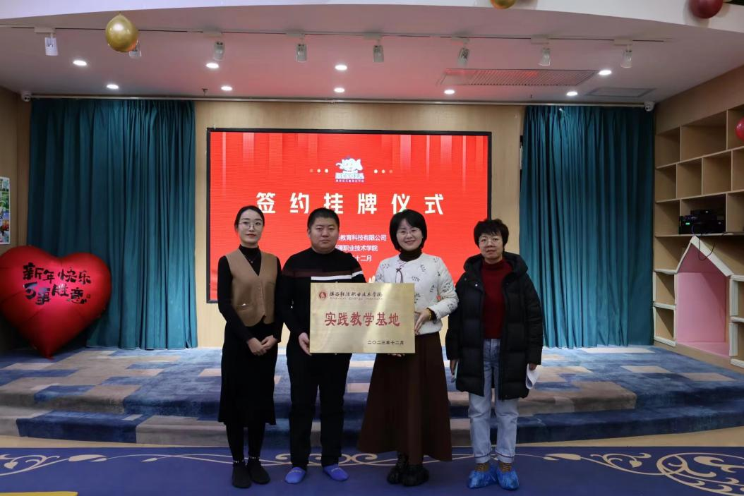 王利荣代表我校分别与培优乐儿童成长中心园长拓漪静、榆林爱加壹壹文化科技有限公司总经理陈轶德签订了校企合作实践教学基地合作协议,并与陕西培优乐教育科技有限公司总经理王峰、榆林爱加壹壹文化科技有限公司总经理陈轶德为实践教学基地挂牌。