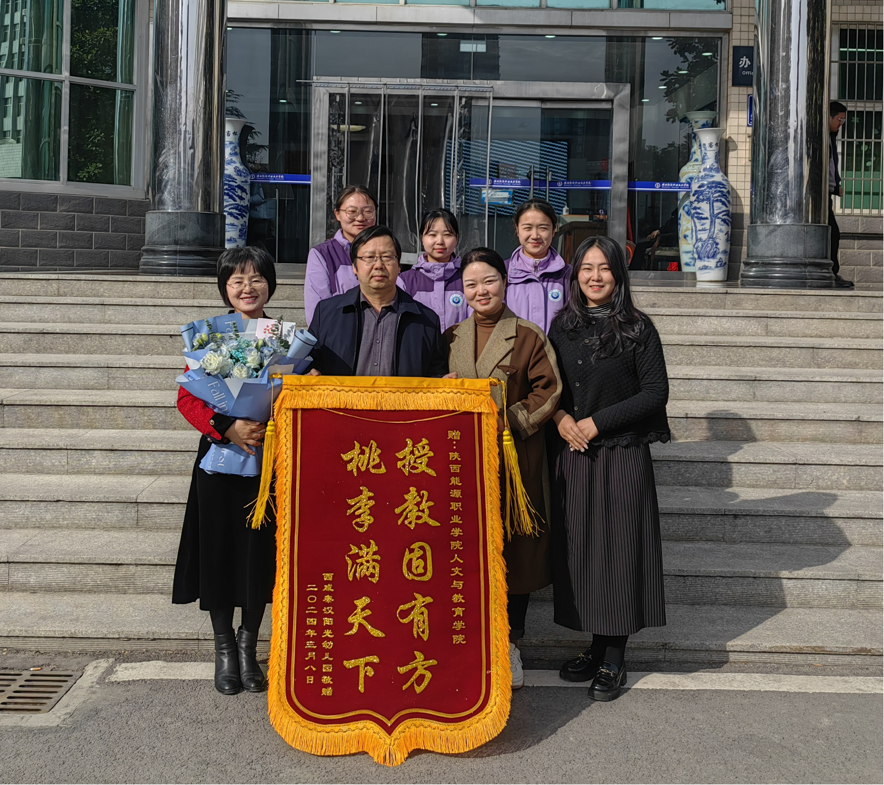 随后,王园长将刻有“授教固有方 桃李满天下”的锦旗郑重地递交给我校代表,以表感谢之情。