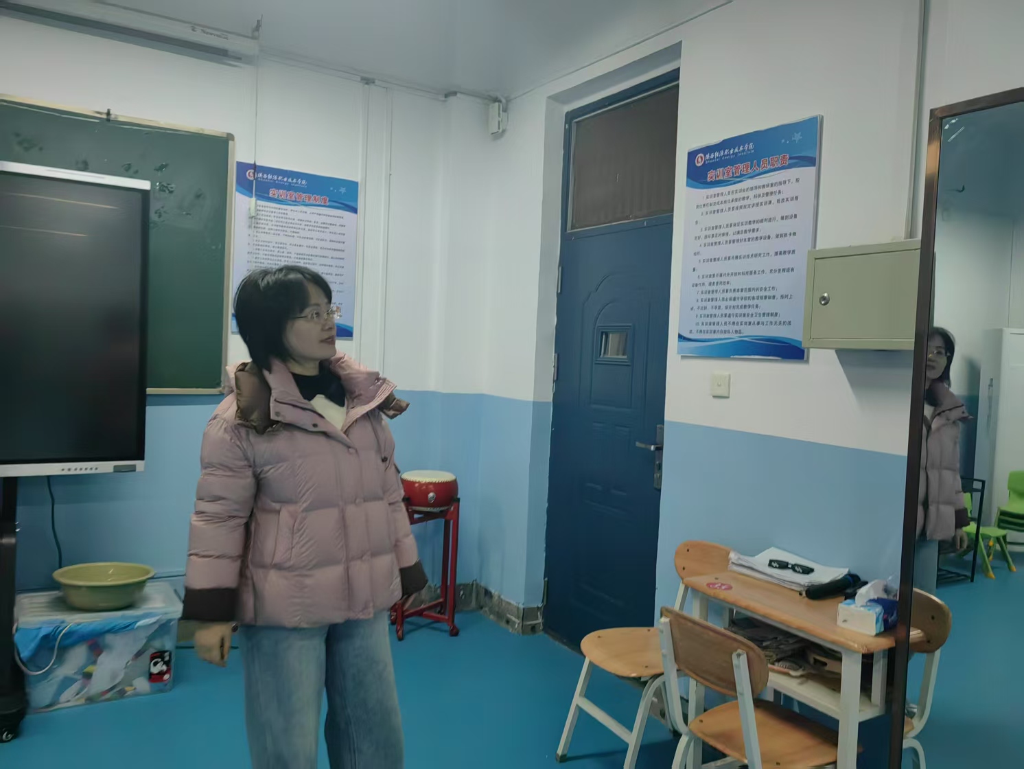 本次检查主要包括早教实训室、婴幼儿照护实训室、舞蹈实训室等。王院长强调,托育实训中心是培养专业托育人才的重要阵地,要高度重视设备的维护与管理,加强技术培训和安全操作指导,为学生提供一个安全、高效的实训环境。