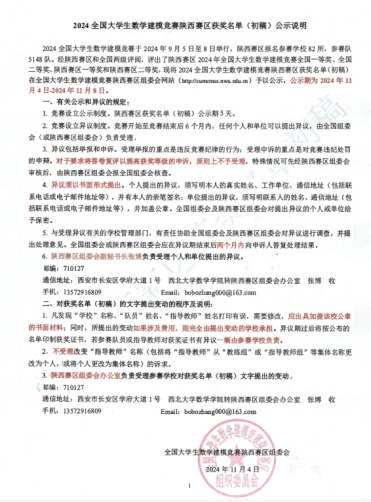 11月4日,全国大学生数学建模竞赛陕西赛区组委会公布了《2024全国大学生数学建模竞赛陕西赛区获奖名单(初稿)》。在学校领导的大力支持和深切关怀下,在我院及其他职能处室的配合与帮助下,我院25支参赛队取得了骄人的成绩,获国家一等奖1项、国家二等奖3项、陕西省一等奖2项、陕西省二等奖7项的优异成绩。其中,田茹会老师指导的团队荣获专科组全国一等奖;沈璐璐老师、陈欢老师、土晗老师指导的团队均荣获专科组全国二等奖。