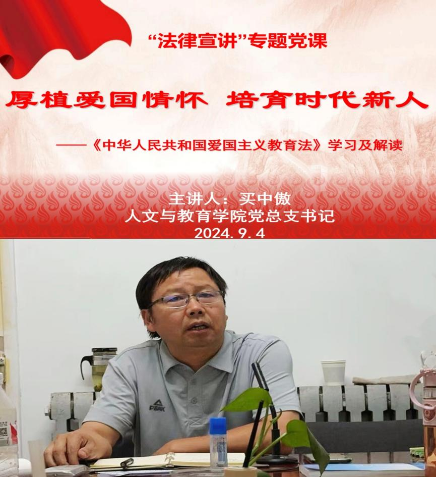 为认真学习贯彻党的二十届三中全会精神、习近平法治思想和习近平总书记关于宪法法治教育的重要指示精神,增强教职工法治观念和爱国情怀,9月4日下午,人文与教育学院党总支在学院会议室,通过线上线下的方式召开全体教职工大会,学院党总支书记买中傲以“厚植爱国情怀,培育时代新人”为主题,为全体教师上了一堂学习《中华人民共和国爱国主义教育法》的专题党课。