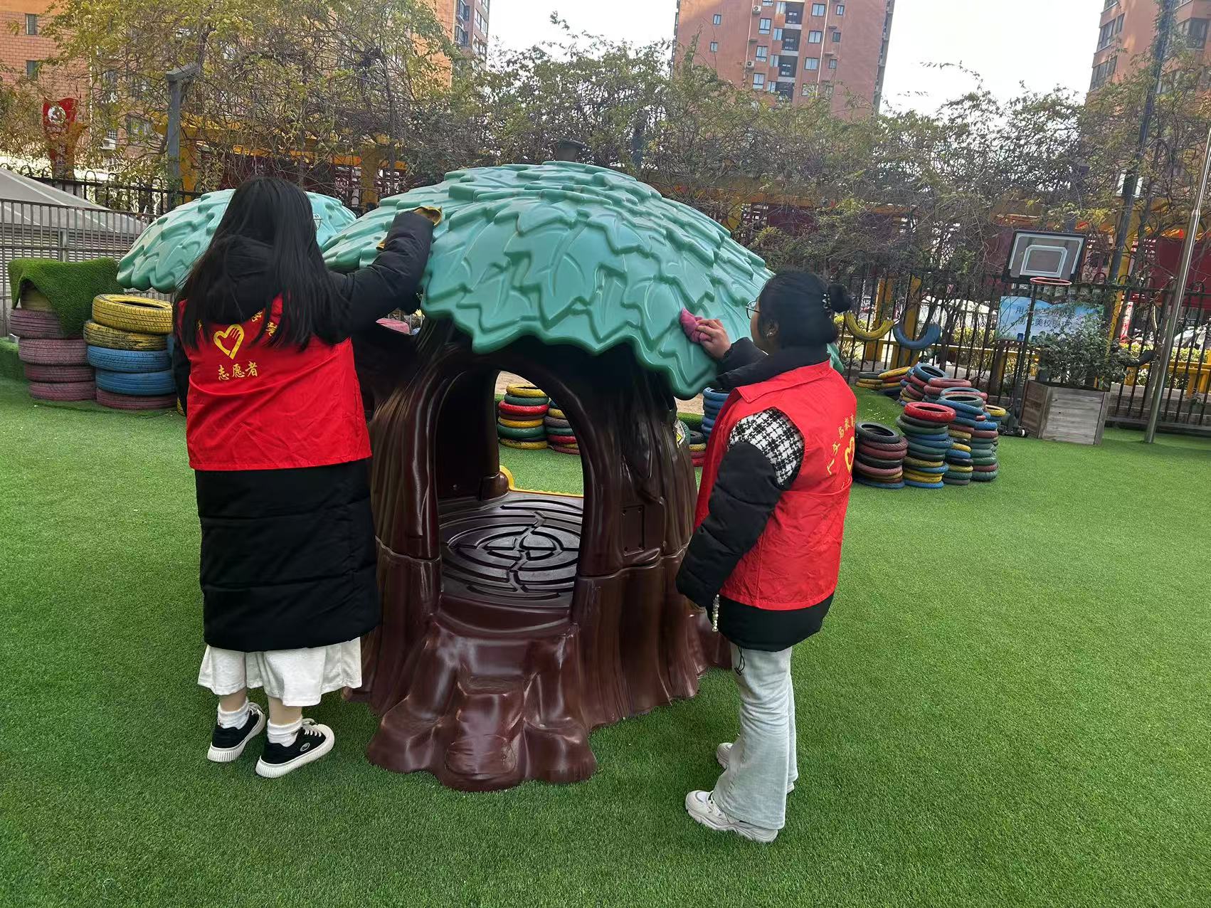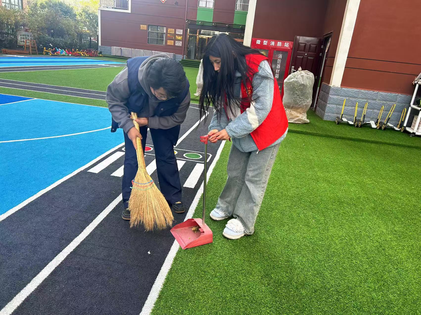 表演结束后,志愿者们并没有停下脚步,而是迅速投入到志愿服务中。他们协助幼儿园老师组织孩子们进行游戏活动,耐心地陪伴在孩子们身边,为他们讲解游戏规则,鼓励他们勇敢尝试、积极参与,操场上回荡着孩子们银铃般的笑声。他们自愿为幼儿园进行清洁服务,为营造孩子们干净安全的环境贡献一份力量。