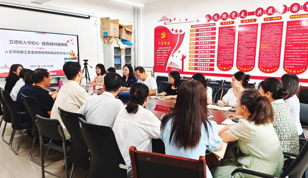 为进一步加强教师队伍建设,提升教师职业道德素养,6月18日下午,人文教育学院教工党支部于办公楼508开展了以“立德树人守初心自查自纠强师风”为主题的师德师风专题会议。支部全体党员通过线上线下相结合的方式共同参与了此次会议,会议由支部书记王少华主持。