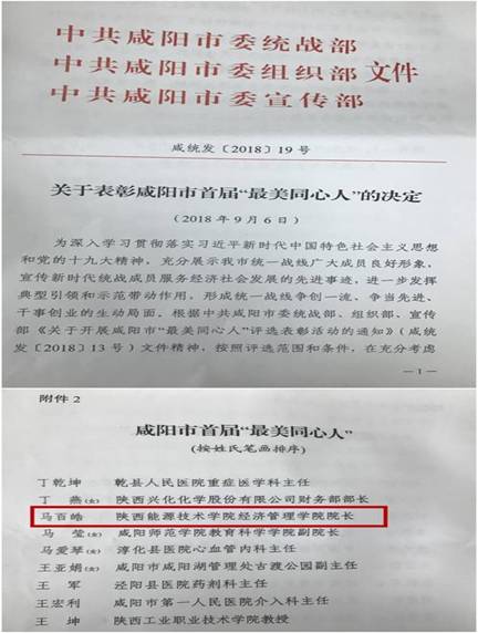 根据中共咸阳市委统战部《关于表彰咸阳市首届“最美同心人”的决定》(咸统发[2018]19号)文件,经管学院院长、九三学社能源学院支社主委马百皓荣获咸阳市首届“最美同心人”称号。9月26日晚,咸阳市统一战线“践行新思想,逐梦新时代”先进典型表彰活动在大秦剧院举行,省委统战部常务副部长陈光明,咸阳市委书记岳亮,市长卫华,市委常委马俊民、崔勒宇为先进典型代表颁奖。