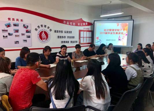 2019年7月7日下午,在办公楼412会议室,经管学院召开2019届毕业生代表座谈会。学院党总支书记李鲜玲、院长马百皓、学工办老师及优秀毕业生、年级校友理事、建档立卡学生代表参加座谈会,会议由学院党总支副书记院长助理李海霞老师主持。