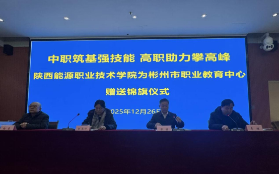 2025年12月26日上午,陕西能源职业技术学院信息商务学院党总支书记赵亚玲、实践教学管理处副处长杨勇、信息商务学院学工办主任杜康、信息商务学院商务与物流教研室魏頔、电商2401班程小东,前往彬州市职业教育中心,进行赠送锦旗并开展合作交流的活动。双方以我校电商2401班程小东在世界职业院校技能大赛中荣获金奖为契机,通过座谈、参观、实训指导及经验交流等多种形式,全面展示了两校协同育人成果,并就深化中高职衔接合作机制展开深入研讨。