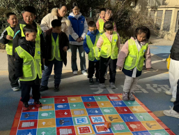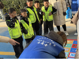 活动现场,志愿者们身着统一蓝色马甲,带领孩子们开展了丰富的互动环节:从整齐划一的暖场律动操,到考验协作的“接力传递”小游戏,再到融入知识科普的趣味飞行棋,每个环节都充满欢声笑语。孩子们穿着亮眼的荧光黄背心,在志愿者的引导下积极参与,既锻炼了团队协作能力,也在游戏中收获了快乐。活动尾声,志愿者、社区工作人员与孩子们共同合影留念,见证了这场公益行动的暖心时刻。