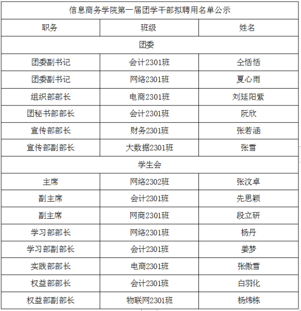 为积极响应《关于二级学院设置调整的通知》(陕能院党〔2025〕1号)文件精神,进一步推动信息商务学院的快速发展,加强学生干部队伍的建设,经过严格的选拔与考察程序,我院学生会现已组建完成一支充满活力、责任心强、服务意识浓的学生干部队伍。这支队伍将致力于服务广大同学,积极参与学院各项事务,为学院的持续发展贡献力量。现将团学干部名单公示如下: